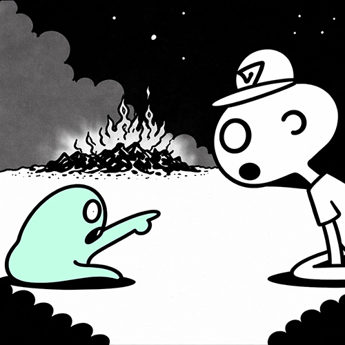 ALIENS: We destroyed it like he said Voltran will be so proud With the Gallahad boss dead No one will stop us now VICE PRINCIPAL: What’s going on there? I can’t help myself but stare Be aware, but beware Of how warily I dare To be seen at the scene Meaning not to intervene Just a spy, just an eye Nosy knows not when to pry PIZZA DUDE: This has never happened before I don’t know quite what to do Maybe I’ll just call my boss I’m sure he’ll help me through Hey boss, it’s me I just wanted to see What I should I do The house exploded in front of me I still got these pies Boy they look nice Should I bring them back? BOSS [ON CELL PHONE]: No, no! No, no! What are you some kind of idiot?! No, no! No, no! I give you money And you bring the pies No, no! (OK, Boss!) No, no! (Sure thing, Boss!) What are you, some kind of idiot? PIZZA DUDE & VICE PRINCIPAL: The house is burning down The house is burning down The flames are all around The flames are all around There’s something on the ground There’s something on the ground What in the name of Jeez Louise is this I’ve found? What in the name of Jeez Louise is this he’s found? BRINKLEY [DYING ALIEN]: Hello, delivery guy, I’m glad that you came in I am about to die, and I’m an alien! PIZZA DUDE: Would you please tell me why your house was blasted in? BRINKLEY: Sit down and listen, I was about to begin On the planet Kliftane I was born and raised Parents taught me good I was fond of food So much that I had a great design A clean, affordable place to dine I opened it when I was twenty-six Named it after my dad, called it Gallahad’s Then we began to expand To other galaxy stands So much damn profit in my pocket But I was never one to love money So I put it all back in the company We made our food real healthy And kept our prices low That’s when we crossed some other folks (Who you now know) Did you see that guy in the big spaceship? His name is Voltran; he’s a piece of shit He runs our competition They’re called Galaxio’s They only care about money, and it shows A few years back, they started pushing us around And all our rival stores fought in rival towns We came to Earth to find pizza The food that you all love To win in business we need something highly spoken of After you were going to deliver it I was gonna take it to my guy and split But you gotta do it for me Bring it to my guy You’ll notice him… he’s got three thousand eyes You’ll do fine, boy! You’ve just gotta hurry, there’s not a lot of time! To Clams Casino!